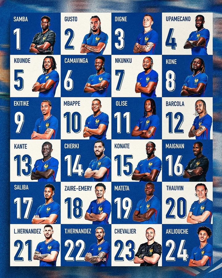 扫描下载懂球帝首页>动态> 法国队最新球衣号码:恩昆库7号,坎特13号,谢尔基14号