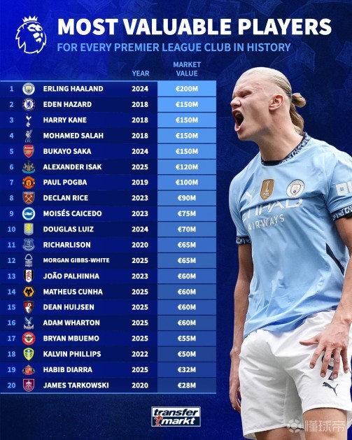 扫描下载懂球帝首页>动态> 本赛季英超各队历史身价最高球员:哈兰德第1,4人1.5亿第2