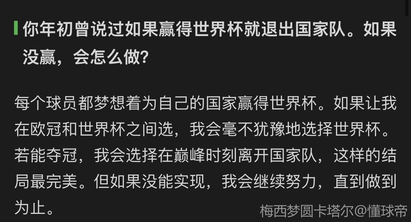 每个球员都梦想着为自己的国家赢得世界杯。如果让我在欧冠和世界杯之间选,我会毫不犹豫地选择世界杯。若能夺冠,我会选择在巅峰时刻离开国家队,这样的结局最完美。但如果没能实现,我会继续努力,直到做到为止。