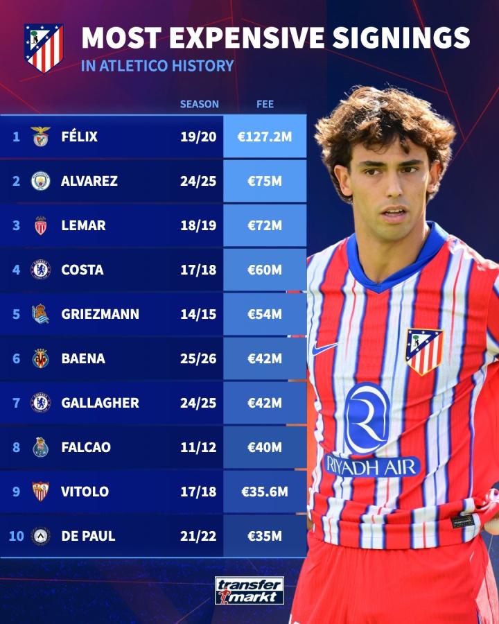 扫描下载懂球帝首页>动态> 马竞队史最贵引援榜:菲利克斯1.272亿欧居首,小蜘蛛位居次席