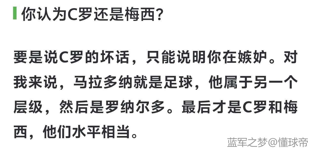要是说C罗的坏话,只能说明你在嫉妒。对我来说,马拉多纳就是足球,他属于另一个层级,然后是罗纳尔多。最后才是C罗和梅西,他们水平相当。