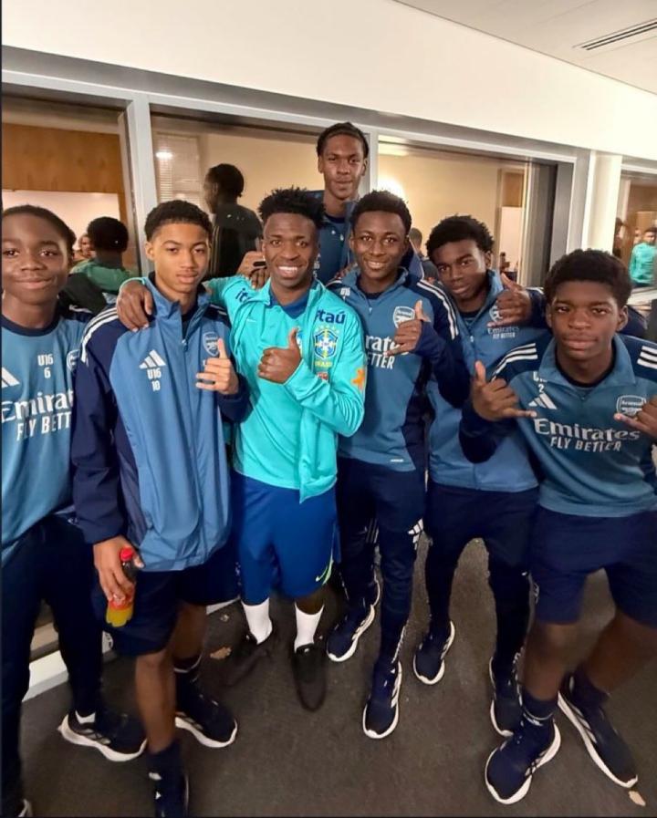 扫描下载懂球帝首页>动态> 正随巴西在枪手基地训练,维尼修斯与多名阿森纳青训球员合影