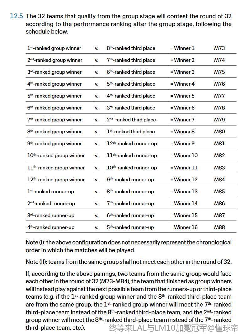 1/16决赛的对阵情况完全由小组赛的成绩决定。12个小组第一进行排名,12个小组第二进行排名,8个小组第三进行排名。不妨设成绩第x好的小组第一为Wx(1≤x≤12),成绩第y好的小组第二为RUy(1≤y≤12),成绩第z好的小组第三为3Pz(1≤z≤8)。