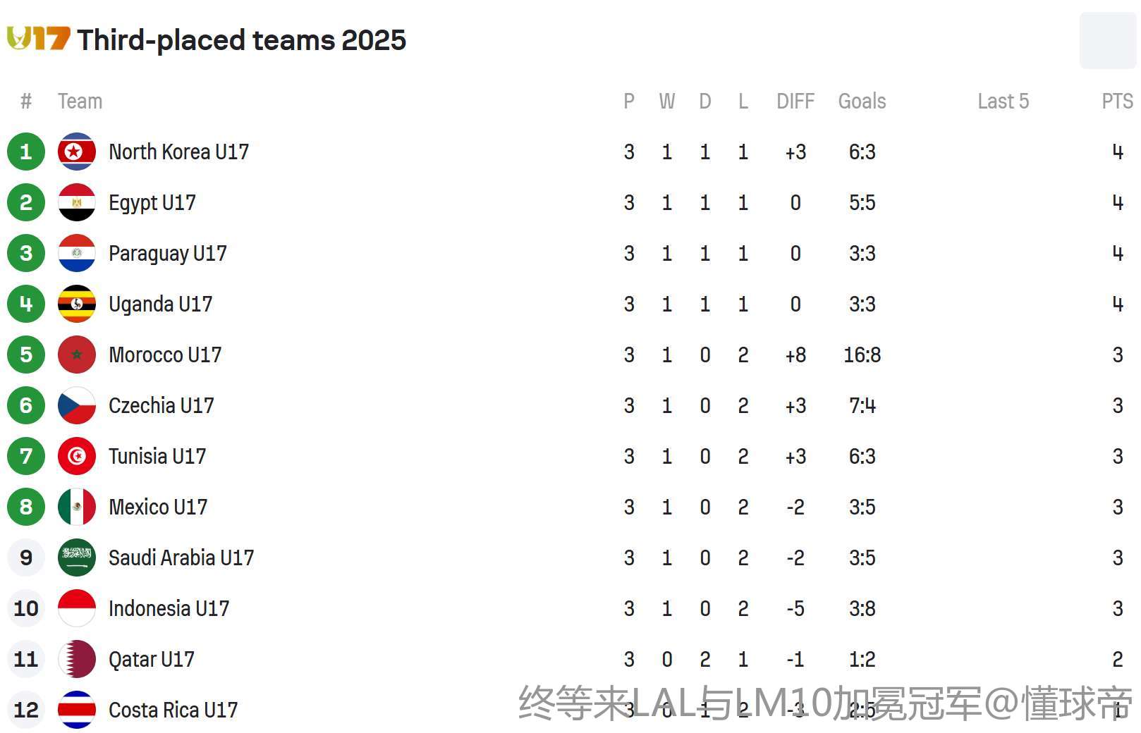 小组第三乌干达和巴拉圭同为4分3进球3失球,纪律分也同为-5,但巴拉圭有官员吃牌,故乌干达为3P3,巴拉圭为3P4。
