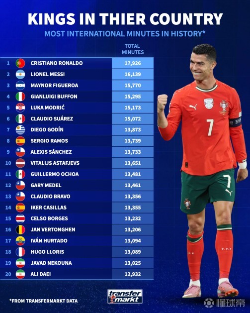 扫描下载懂球帝首页>动态> 德转统计国家队出场时间前20:C罗、梅西前2,布冯、魔笛上榜