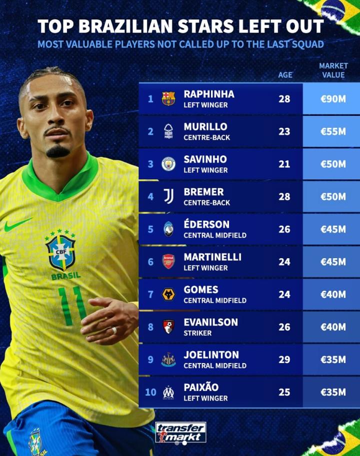 扫描下载懂球帝首页>动态> 此次未入选巴西队身价前10:拉菲尼亚、萨维尼奥、马丁内利在列