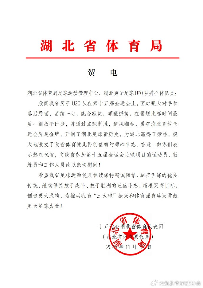 北京时间11月13日,湖北省体育代表团为在全运会夺得金牌的湖北U20男足送上贺电。