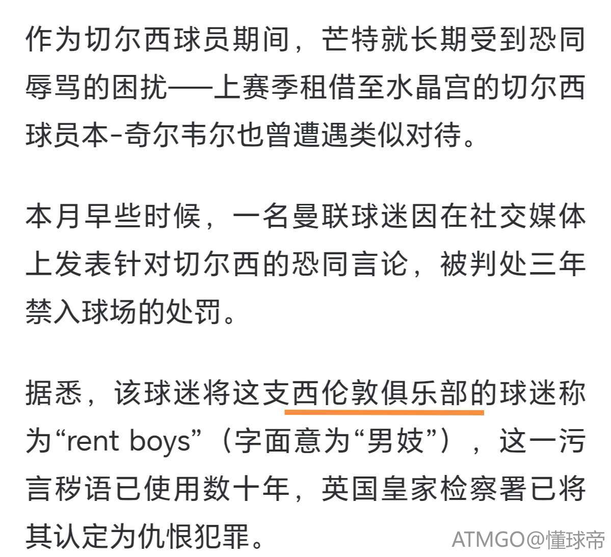 作为切尔西球员期间,芒特就长期受到恐同辱骂的困扰——上赛季租借至水晶宫的切尔西球员本-奇尔韦尔也曾遭遇类似对待。