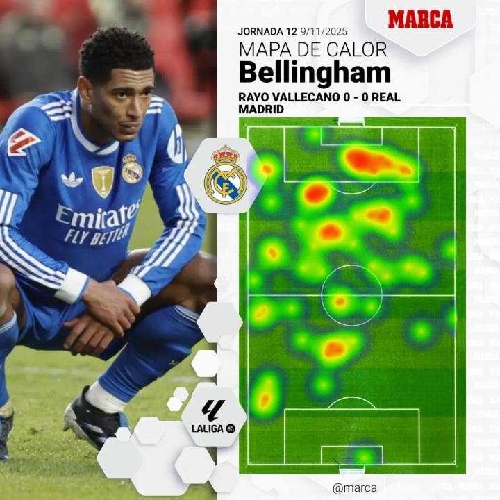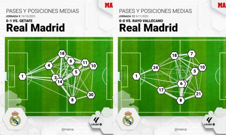 传球地图勾勒出这一更深层次变化的X光片。在赫塔费一役中,球队整体紧凑,后腰与贝林厄姆之间形成了清晰的三角形连接,能够通过中场将球队串联起来。但在巴列卡诺,局面被拉长,卡马文加和居莱尔的位置重叠,贝林厄姆变得更加孤立。传球线路转移到了边路。由于难以通过中场推进,边后卫——巴尔韦德和卡拉雷斯——成为了新的发起者。中场的配合逐渐消散于一张更宽但也更脆弱的网络之中。