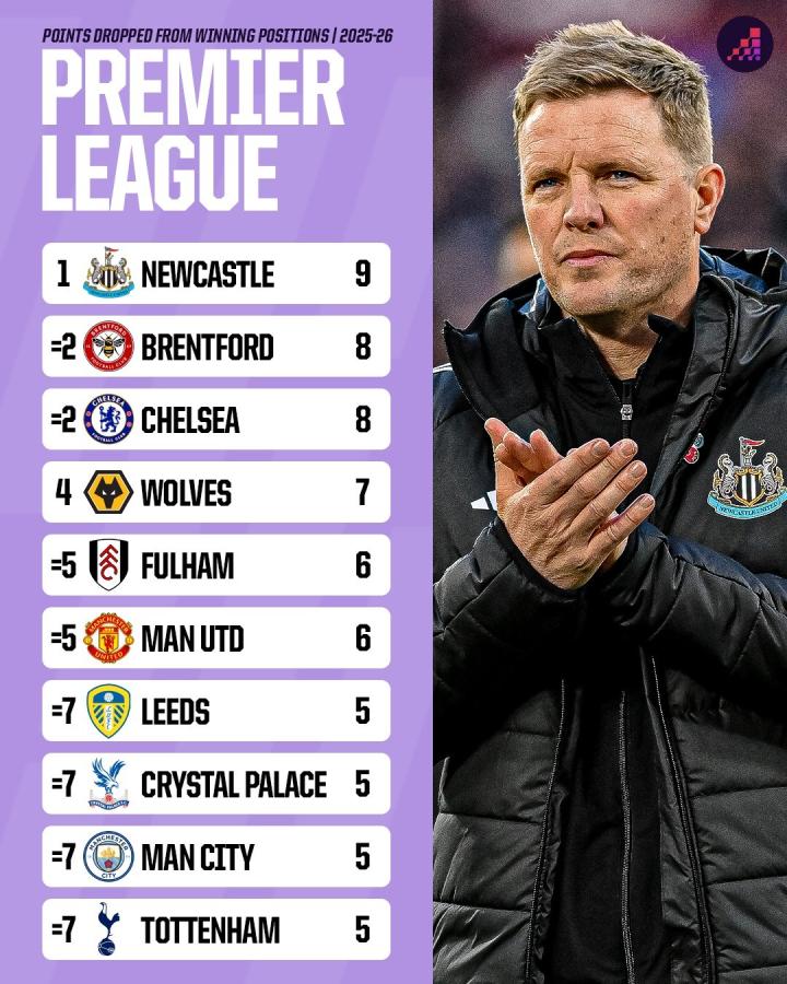 扫描下载懂球帝首页>动态> 英超从领先位置丢分排名:纽卡居首,蓝军、小蜜蜂并列次席