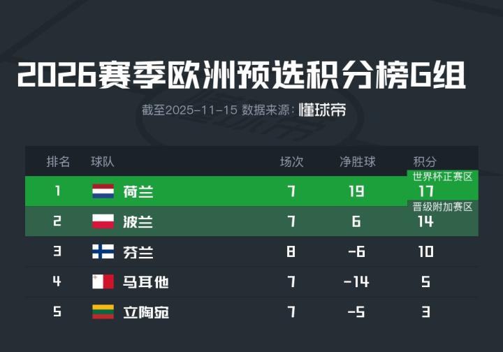 扫描下载懂球帝首页>动态> 领先波兰3分+13个净胜球,荷兰基本锁定美加墨世界杯参赛席位