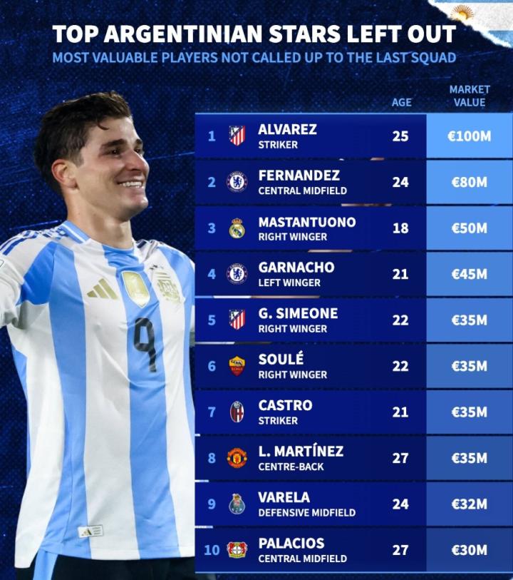 扫描下载懂球帝首页>动态> 此次未入选阿根廷队身价前10:小蜘蛛领先,马斯坦托诺在列