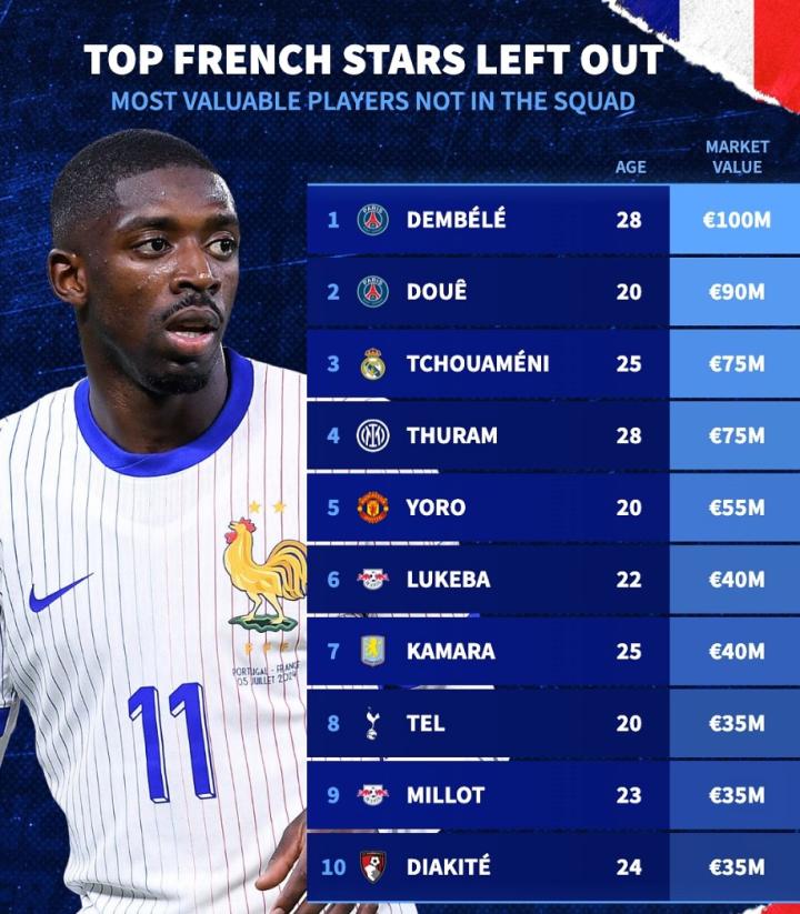 扫描下载懂球帝首页>动态> 此次未入选法国队身价前10:登贝莱领衔,楚阿梅尼、约罗在列