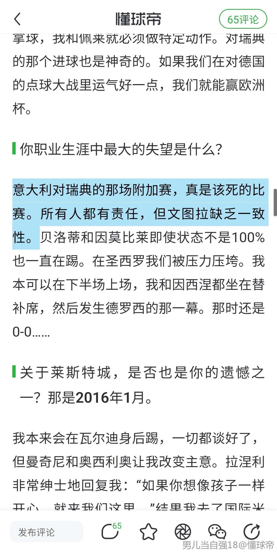 意大利对瑞典的那场附加赛,真是该死的比赛。所有人都有责任,但文图拉缺乏一致性。贝洛蒂和因莫比莱即使状态不是100%也一直在踢。在圣西罗我们被压力压垮。我本可以在下半场上场,我和因西涅都坐在替补席,然后发生德罗西的那一幕。那时还是0-0……