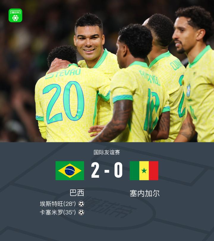 扫描下载懂球帝首页>动态> 巴西2-0塞内加尔,埃斯特旺、卡塞米罗破门,库尼亚两度中框