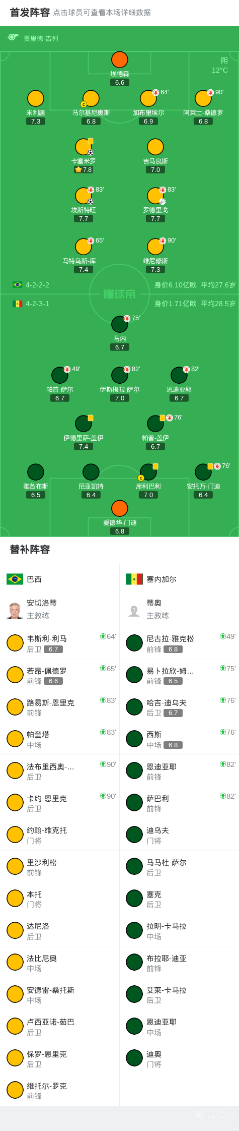 巴西以后就玩防守反击吧 塞内加尔确实也挺强的 世界杯压着荷兰踢 6月份才赢得英格兰 非洲预选赛未尝败绩 今天也算是检验了下世界杯后防线主力 几乎没给塞内加尔多少机会 就是埃德森那一下挺吓人的