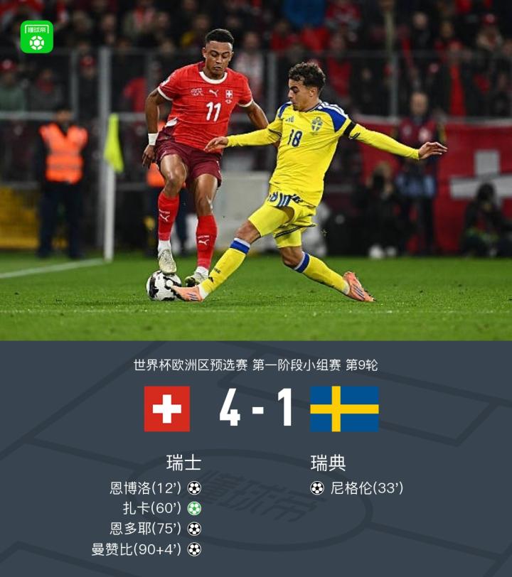 扫描下载懂球帝首页>动态> 瑞士4-1瑞典距离世界杯仅差一分,扎卡点射,恩多耶传射