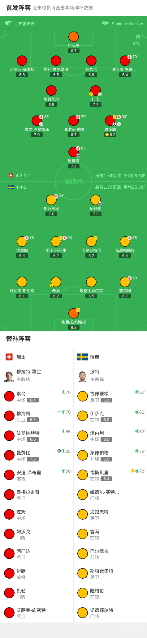 11-16 03:45半场战报:瑞士1-1瑞典,恩博洛,尼格伦破门