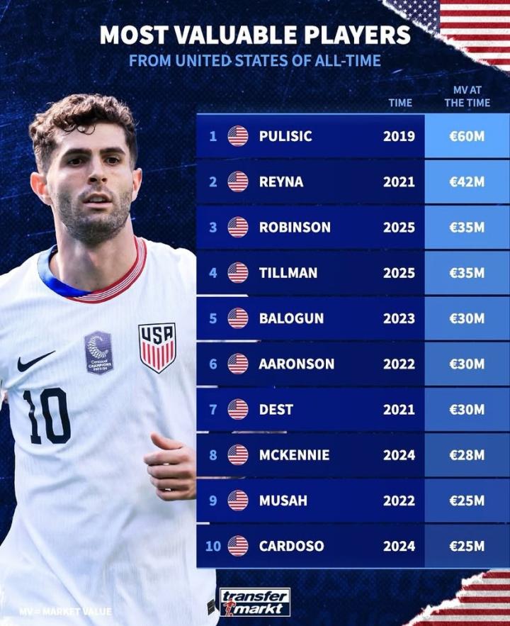 扫描下载懂球帝首页>动态> 德转列美国球员历史身价前10:普利希奇6000万欧元第1