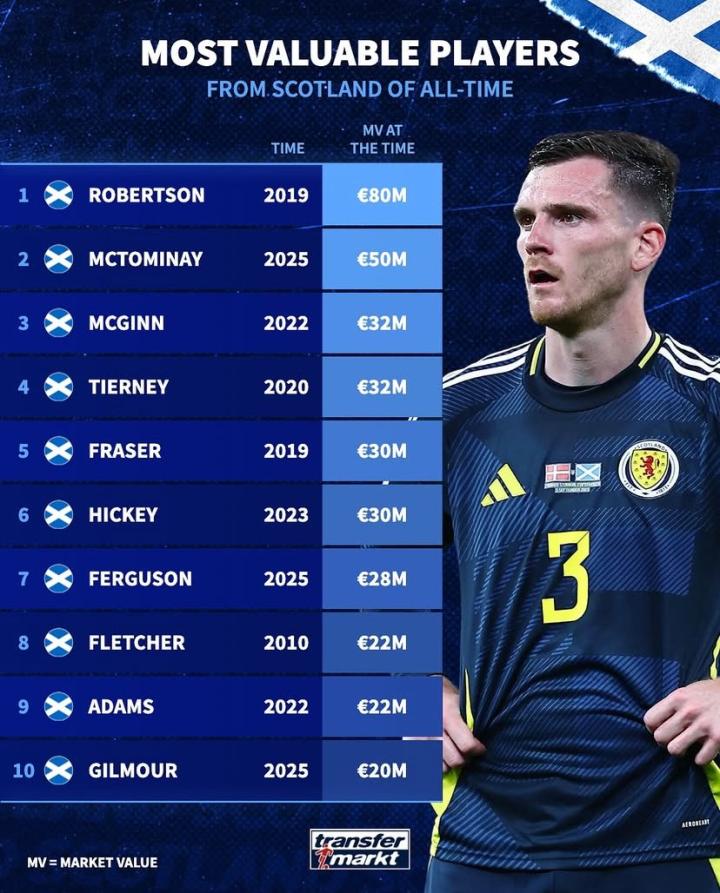扫描下载懂球帝首页>动态> 德转列苏格兰球员历史身价前10:罗伯逊8000万欧第1,小麦第2