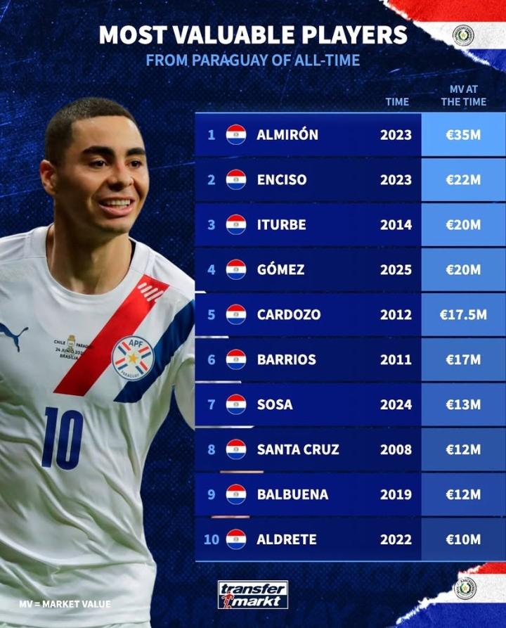 扫描下载懂球帝首页>动态> 德转列巴拉圭球员历史身价前10:阿尔米隆第1,巴里奥斯上榜
