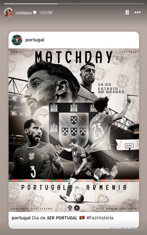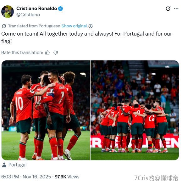 扫描下载懂球帝首页>动态> 葡萄牙迎晋级关键战,C罗晒图助威:为了葡萄牙而战