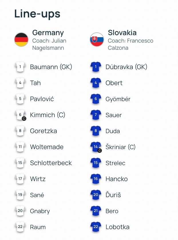 北京时间11月18日凌晨3点45分,世界杯欧洲预选第一阶段小组赛第10轮展开一场焦点战役,德国对阵斯洛伐克。赛前,双方公布首发阵容。