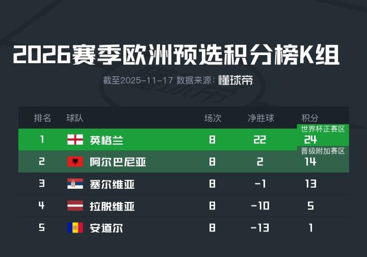 扫描下载懂球帝首页>动态> 欧洲区世预赛K组大结局:英格兰出线,阿尔巴尼亚参加附加赛