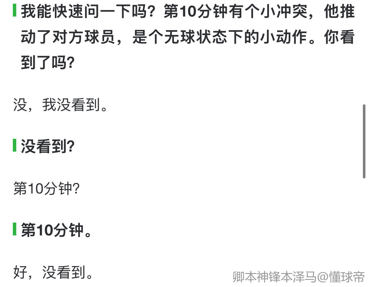 我能快速问一下吗?第10分钟有个小冲突,他推动了对方球员,是个无球状态下的小动作。你看到了吗?
