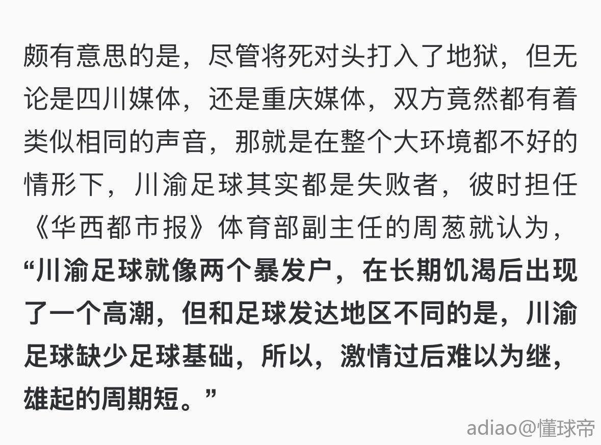 颇有意思的是,尽管将死对头打入了地狱,但无论是四川媒体,还是重庆媒体,双方竟然都有着类似相同的声音,那就是在整个大环境都不好的情形下,川渝足球其实都是失败者,彼时担任《华西都市报》体育部副主任的周葱就认为,“川渝足球就像两个暴发户,在长期饥渴后出现了一个高潮,但和足球发达地区不同的是,川渝足球缺少足球基础,所以,激情过后难以为继,雄起的周期短。”