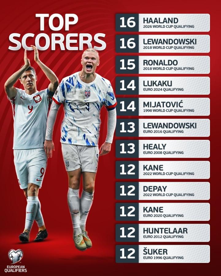 扫描下载懂球帝首页>动态> 单届世欧预/欧预赛进球榜:哈兰德、莱万16球并列第一
