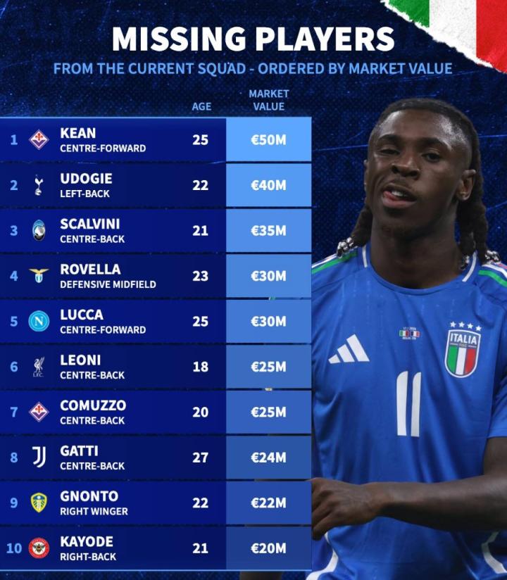 扫描下载懂球帝首页>动态> 此次未入选意大利队身价前10:基恩5000万欧第1,莱昂尼在列