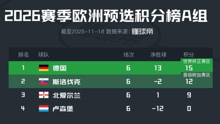 扫描下载懂球帝首页>动态> 世欧预A组结局:德国出线,斯洛伐克、北爱尔兰附加赛
