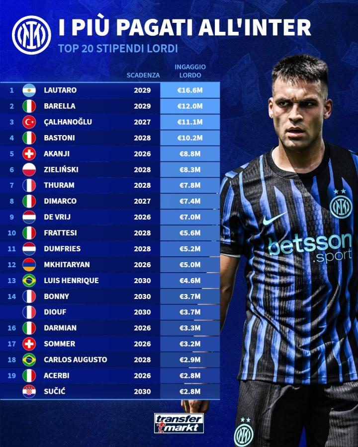 11-18 22:16德转统计了国米球员的税前年薪排行榜单,谁需要加薪...