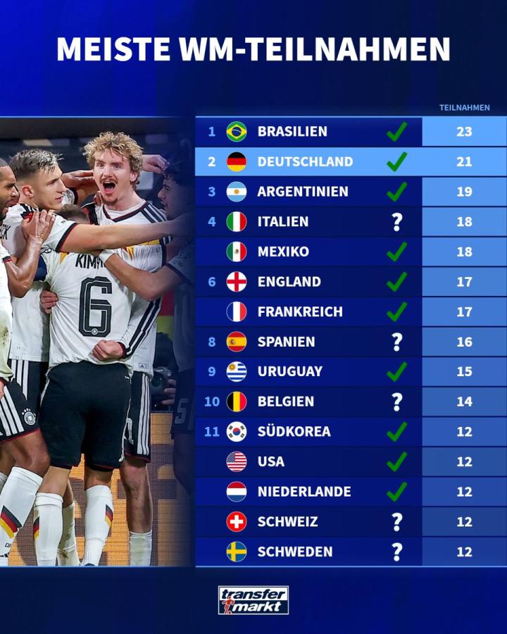 德国队第21次晋级世界杯,仅次于从未缺席的巴西队