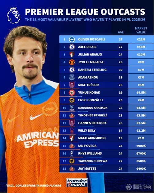 扫描下载懂球帝首页>动态> 德转本赛季英超0出场球员身价:迪萨西、马拉西亚、斯特林在列
