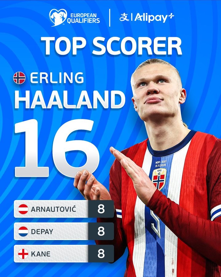 11-18 00:24挪威黄金一代!哈兰德本届世预赛16球2助攻,厄德高1球7助攻