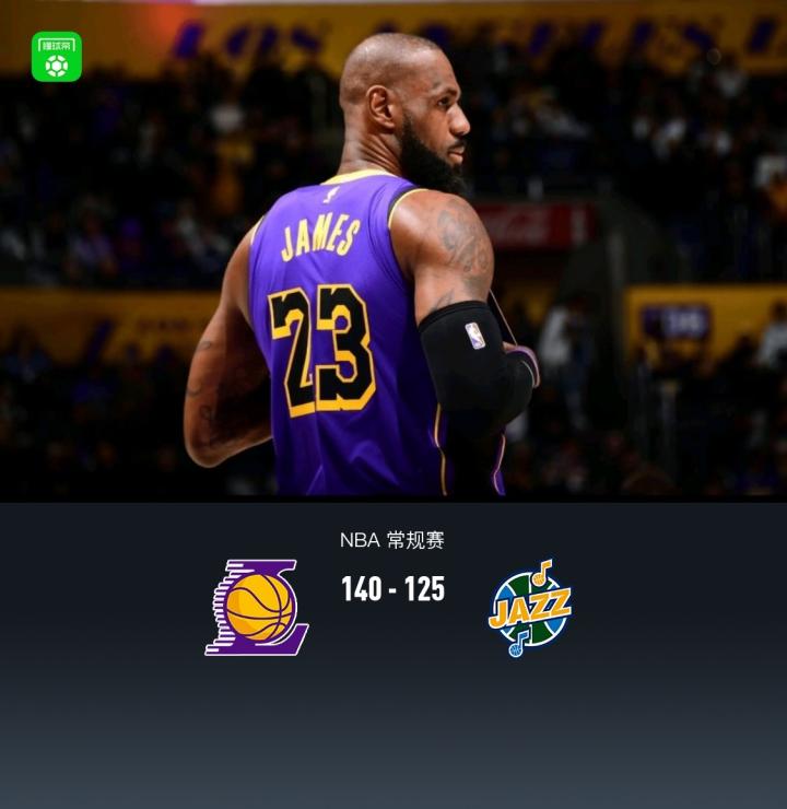 第四节,开节段爵士马尔卡宁、努尔基奇相继得分缩小至5分分差,但随后爵士突然进攻断电,湖人文森特三分稳住局面,随后湖人詹姆斯策动反击艾顿、拉拉维亚持续得分,整体一波20-4将分差拉大至21分,比赛还剩不到半节,双方逐渐撤下主力,最终湖人140-125战胜爵士。