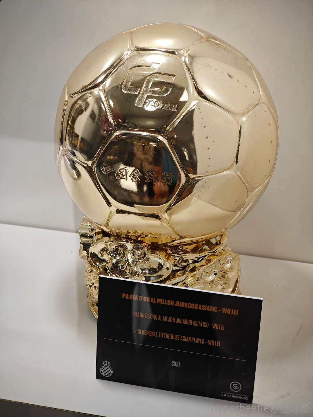 11月7日,我去rcde球场看了磊子哥的中国金球奖奖杯,带我参观的西班牙人工作人员和我说,这是“亚洲金球奖”,武磊是“亚洲最好的球员”,虽然是口误或者是无意(分不清亚洲和中国),但是说明磊子哥在他心中的地位啊!我告诉他,梅伦多也在上海,他穿21号。