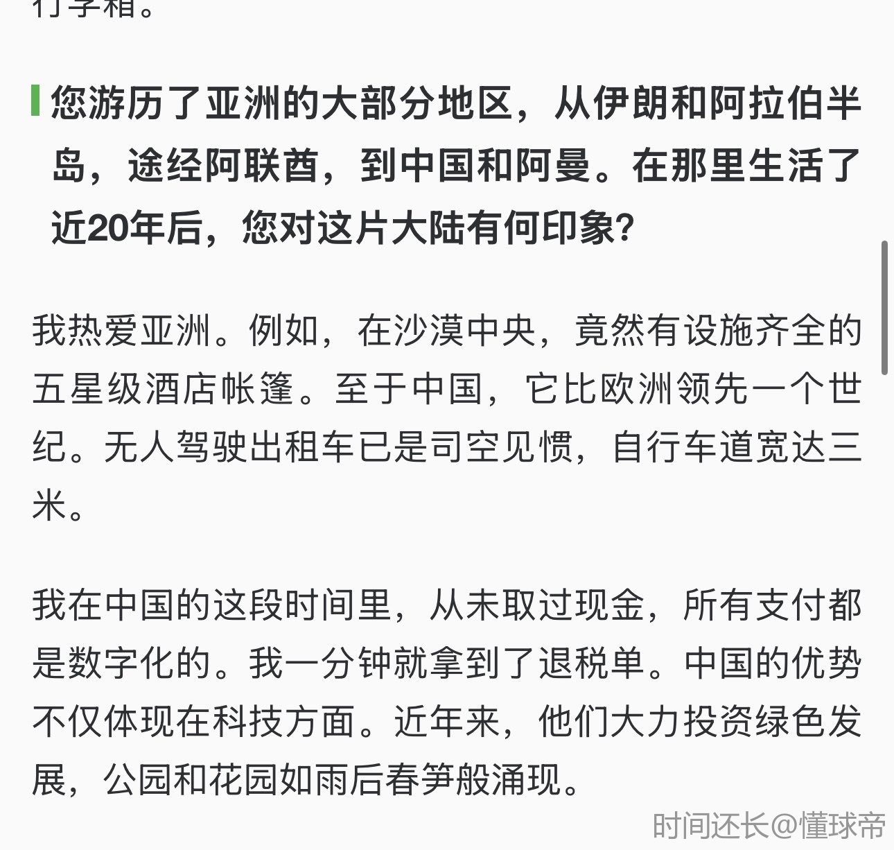 我在中国的这段时间里,从未取过现金,所有支付都是数字化的。我一分钟就拿到了退税单。中国的优势不仅体现在科技方面。近年来,他们大力投资绿色发展,公园和花园如雨后春笋般涌现。