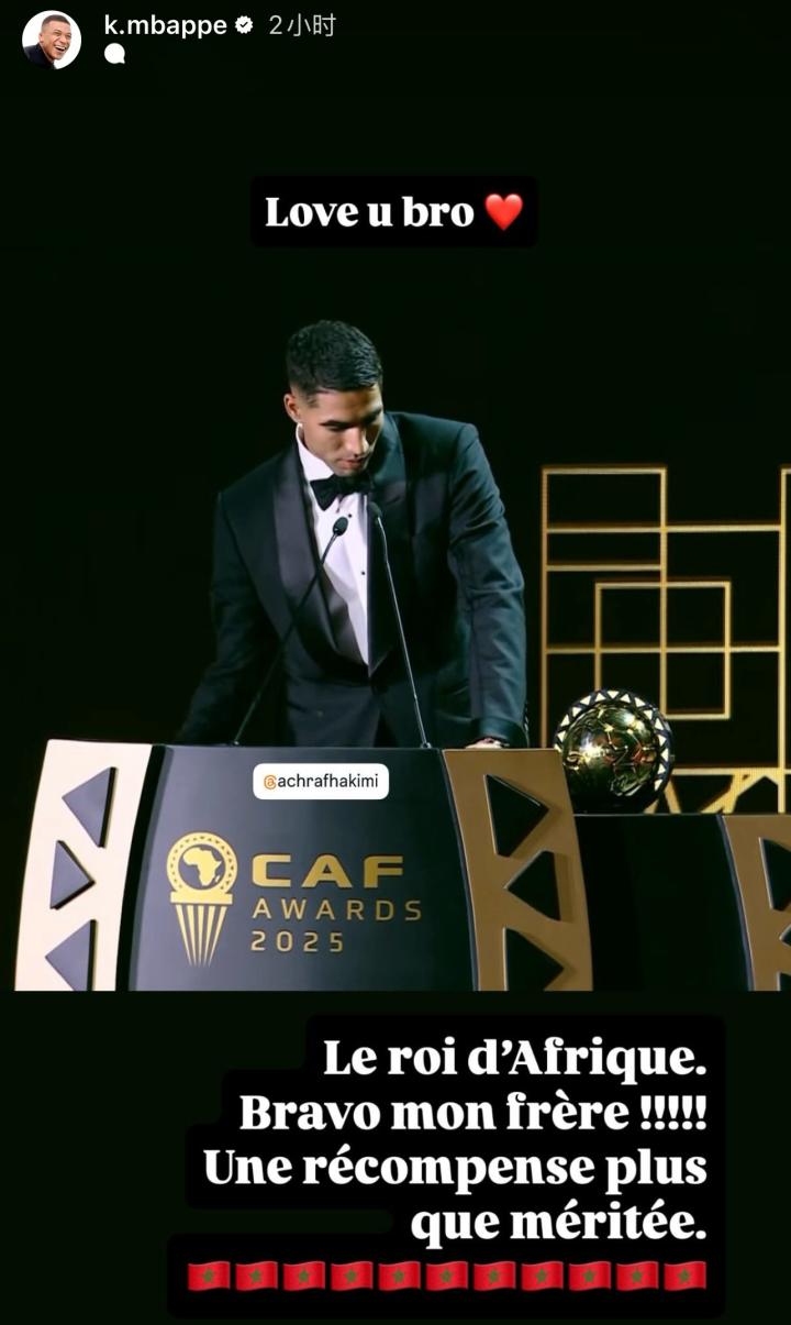 扫描下载懂球帝首页>动态> 姆巴佩祝贺阿什拉夫当选非洲足球先生:爱你,你是非洲之王