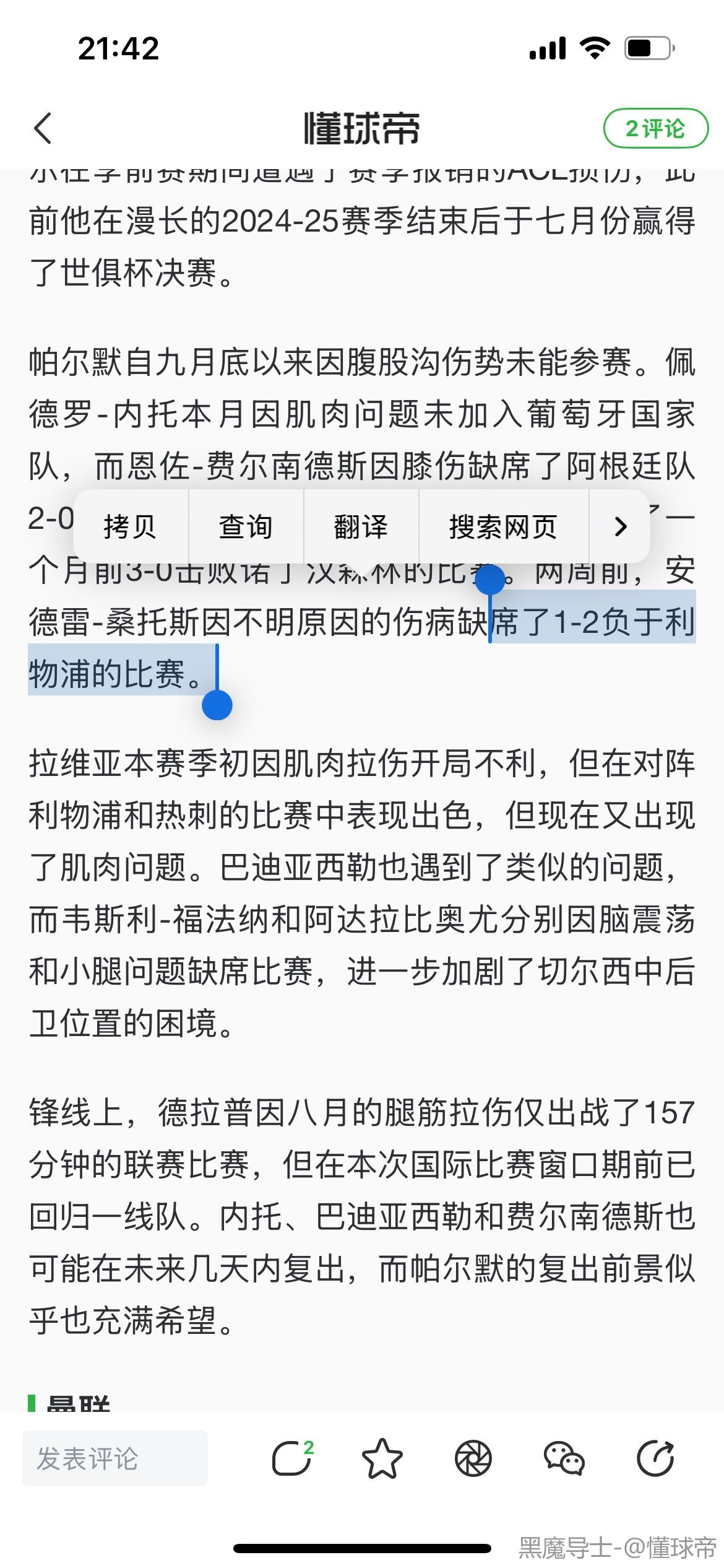 他们目前唯一的长期伤员是科瓦契奇,他因脚踝问题至少会缺席今年余下的所有比赛。罗德里则是另一名伤员,他因腿筋伤缺阵,但可能很快复出。