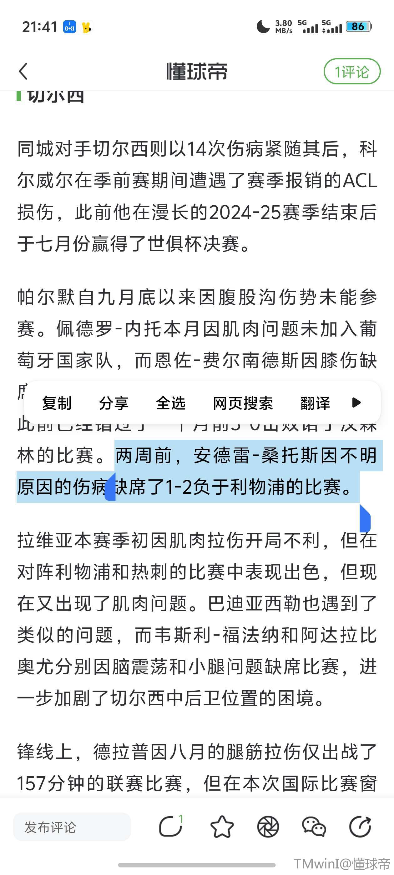 同城对手切尔西则以14次伤病紧随其后,科尔威尔在季前赛期间遭遇了赛季报销的ACL损伤,此前他在漫长的2024-25赛季结束后于七月份赢得了世俱杯决赛。