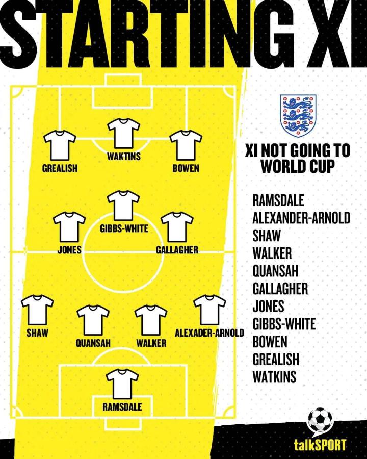 在本特选出的“无缘世界杯”阵容中,门将位置他选择了拉姆斯代尔。后防线四人组中有卢克-肖,中场则由柯蒂斯-琼斯与康纳-加拉格尔搭档。在进攻端,鲍恩、格拉利什、沃特金斯与诺丁汉森林的进攻核心吉布斯-怀特组成了四人组。