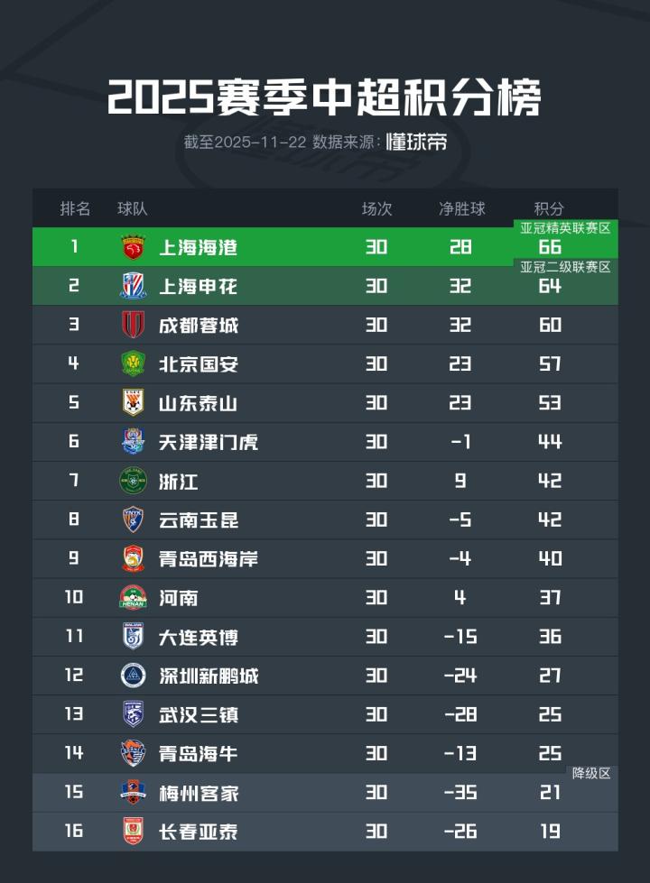 扫描下载懂球帝首页>动态> 2025中超大结局:海港夺冠,亚泰、梅州降级,法比奥金靴