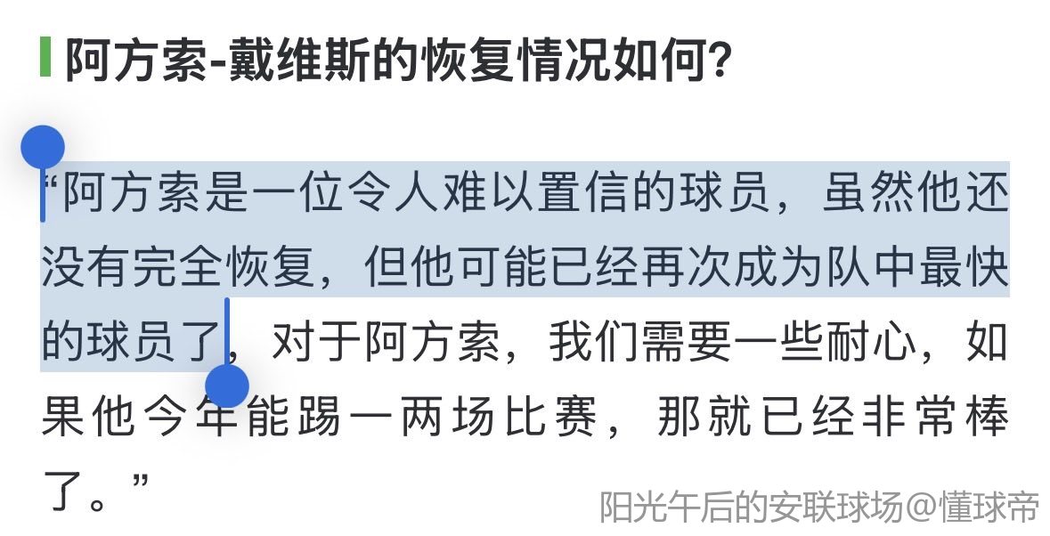“阿方索是一位令人难以置信的球员,虽然他还没有完全恢复,但他可能已经再次成为队中最快的球员了,对于阿方索,我们需要一些耐心,如果他今年能踢一两场比赛,那就已经非常棒了。”
