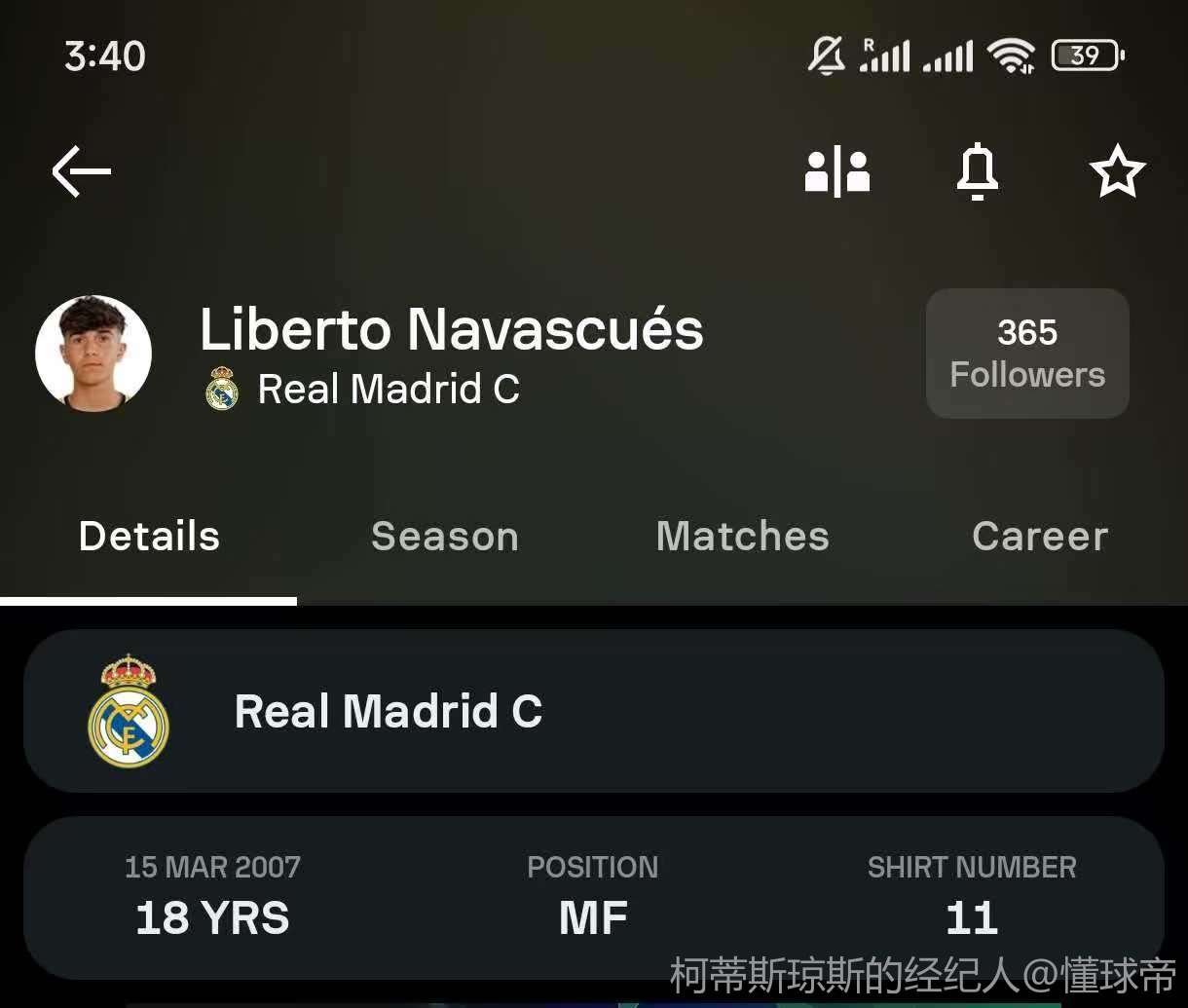 尽管尚未在一队完成首秀,他的市场估值已达到300万欧元,成为与蒂亚戈-皮塔奇和卡斯特罗并列的卡斯蒂亚最有价值球员。