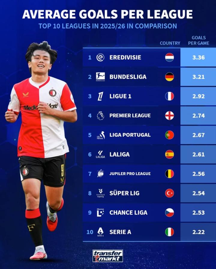 扫描下载懂球帝首页>动态> 欧洲前10联赛场均进球:荷甲3.36球第1,意甲2.22球垫底