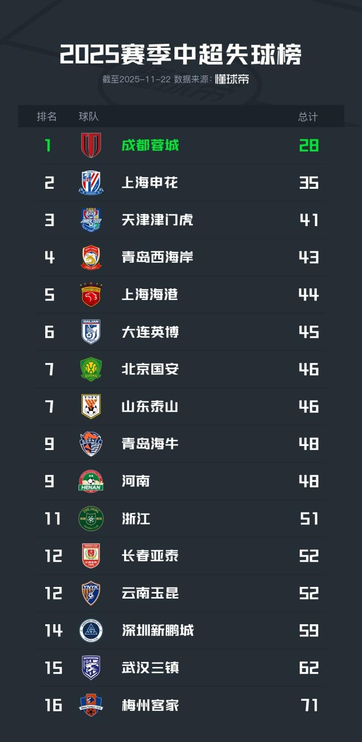 扫描下载懂球帝首页>动态> 本赛季中超丢球榜:成都蓉城28球最少,梅州客家71球最多