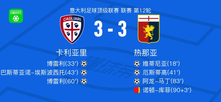 半场战报:卡利亚里2-2热那亚,塞巴斯蒂亚诺-埃斯波西托、博雷利建功,厄斯蒂高、维蒂尼亚破门